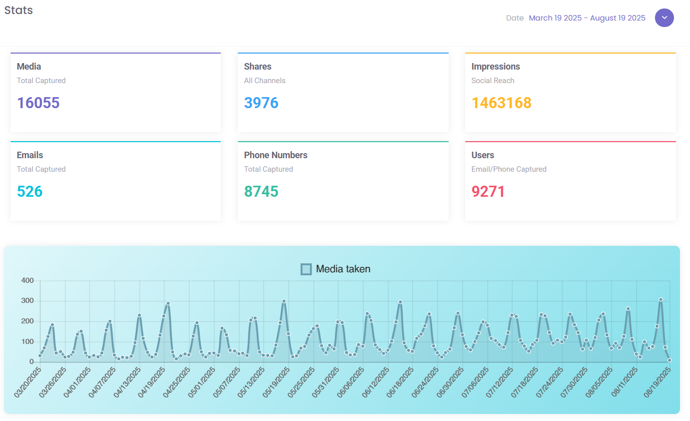 Tracking analytics is key to optimizing marketing efforts. BuzzyBooth's dashboard provides insights into: